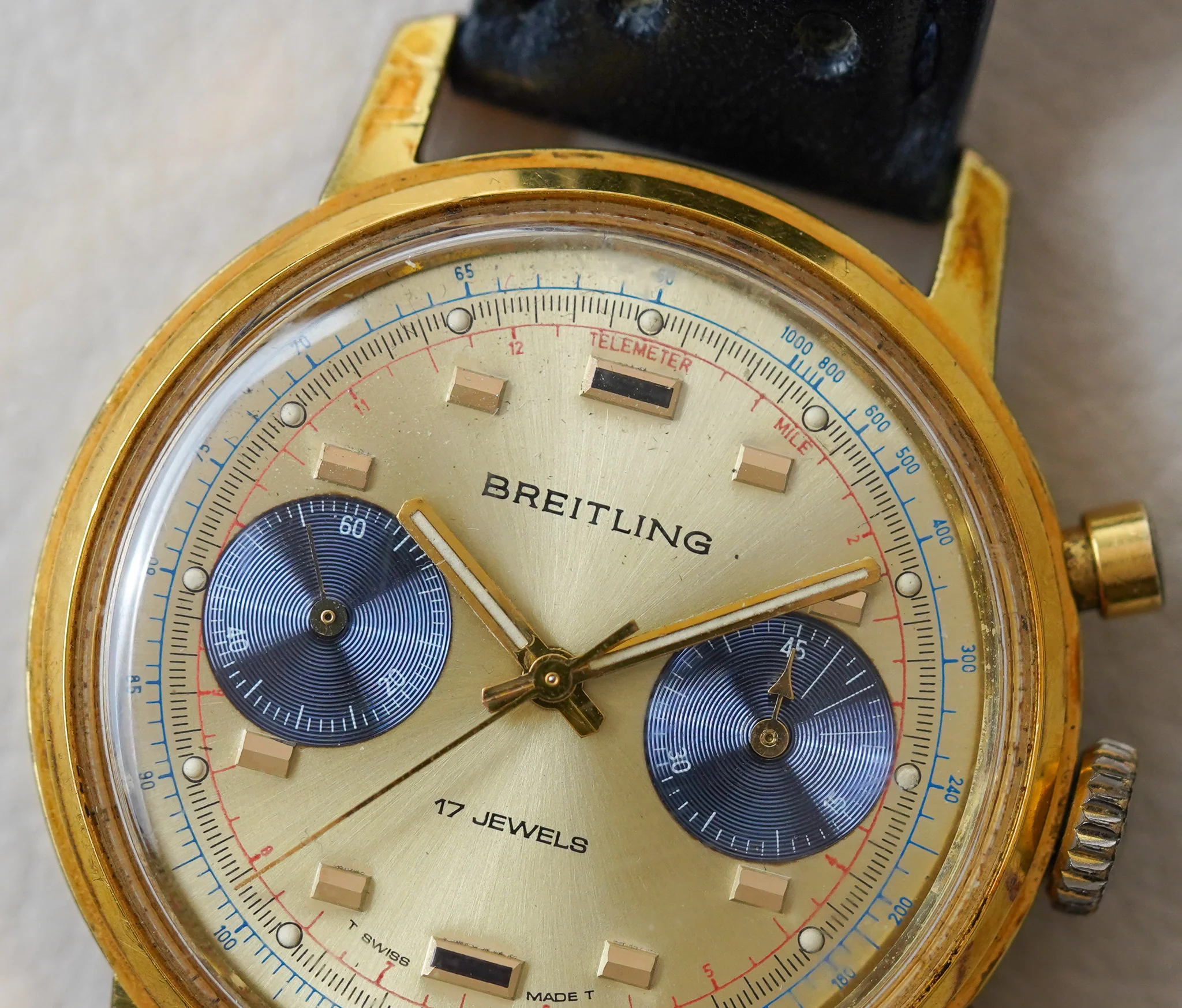 Case has moderate wear with gold worn off in a few spots. Strap has minimal creasing in good shape. Dial has some wear. Hands have some wear. Crystal has minimal wear. Watch is running +3s/d 300 amp.