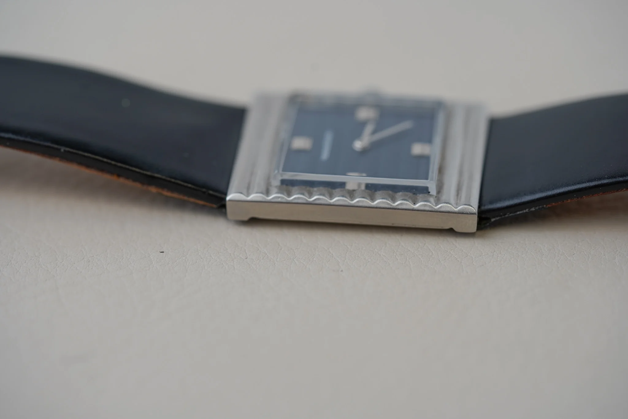In a world consumed by the frenetic pace of modernity, it stood as a beacon of elegance, its tank style design a testament to the enduring power of simplicity. The deep blue textured dial and ribbed case, examples of understated refinement, whispered of a time when true luxury was defined not by ostentatious displays, but by the quiet confidence of impeccable craftsmanship. While the Reverso is widely regarded as the flagship model from Jaeger-LeCoultre, there are other hidden treasures such as this limited edition JLC Vogue 9120 that can hold their own against the very best vintage offerings from the finest Swiss manufacturers. Super rare and presented here in excellent unpolished condition with the original buckle and the limited edition textured blue dial, this 1970s icon epitomises the indifferent, anti-conformist approach to luxury which is typical of the period.