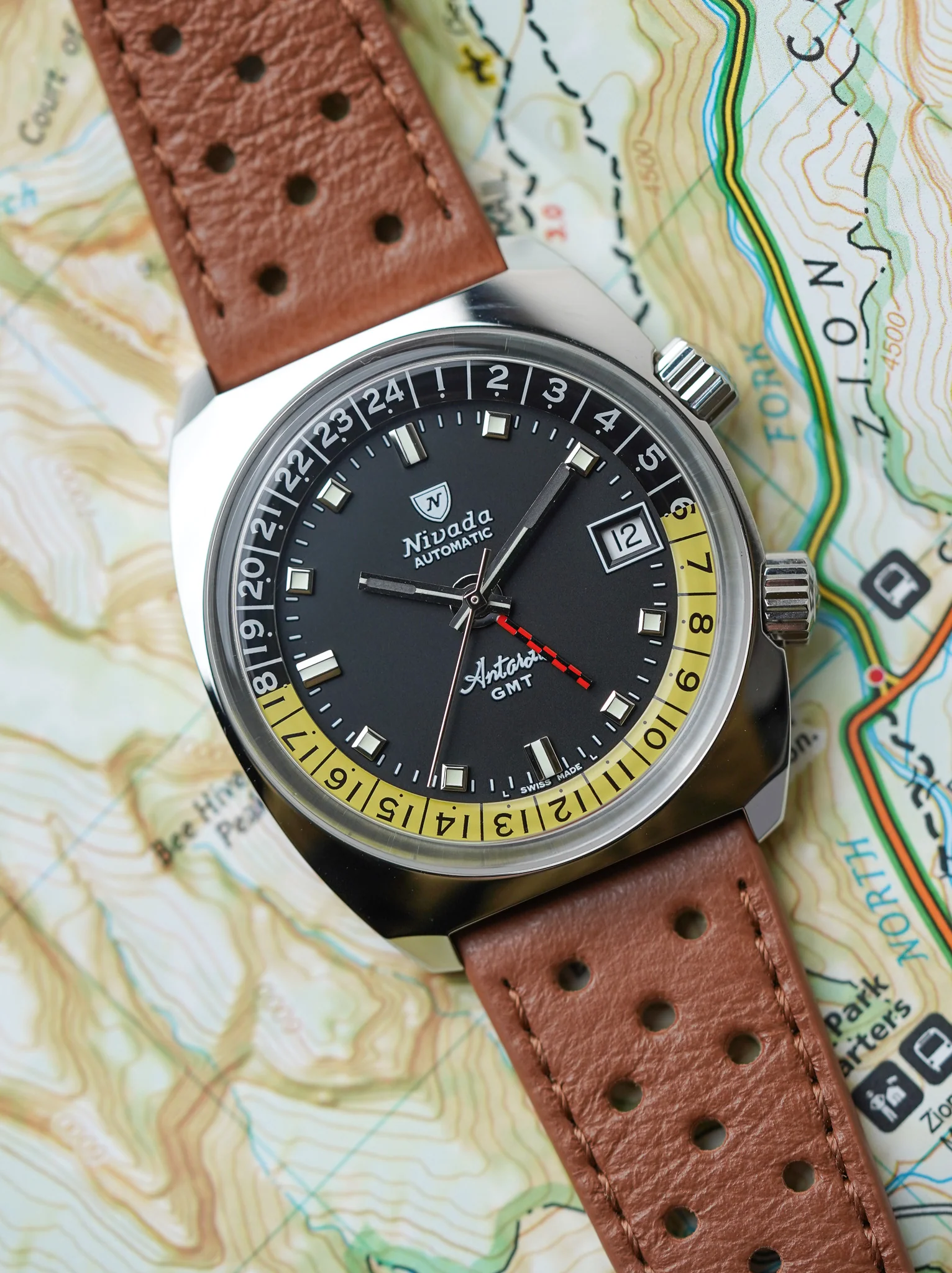The first thing you notice when strapping on the new Antarctic GMT is its presence.It seems like a time capsule from the late 1960s-70s, yet fully in tune with today’s aesthetic codes. With a 36mm diameter, a slim profile of 11.1mm, and a perfectly balanced weight, it’s the ideal companion for crossing time zones with style. In terms of design, the new Antarctic GMT is a faithful homage to the original.The iconic red-and-black GMT hand remains, but now features a Plexiglass insertion the internal bezel for tracking the second time zone. The matte black dial, contrasting with the amber-toned 24-hour bezel, immediately draws the eye, while the thick Plexiglass crystal enhances the watch’s retro appeal and avoids the distortions common with overly thick sapphire glass. At its heart is a Swiss-made SOPROD GMT movement.