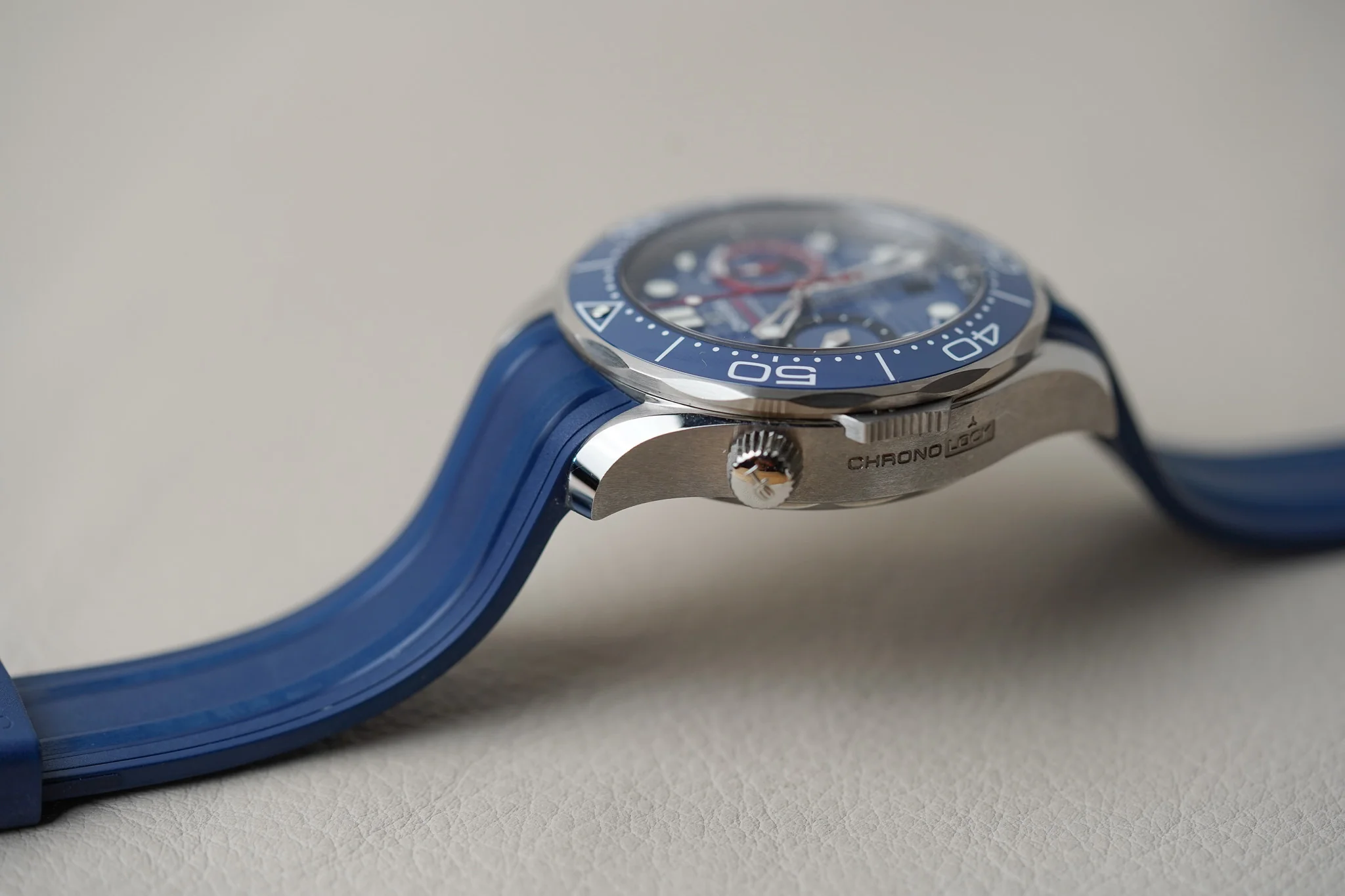 The 44 mm chronograph is built from stainless steel, with a bezel ring in blue ceramic and a white enamel diving scale. To improve grip during water activities, the watch provides blue and red soft-touch pushers in rubber.