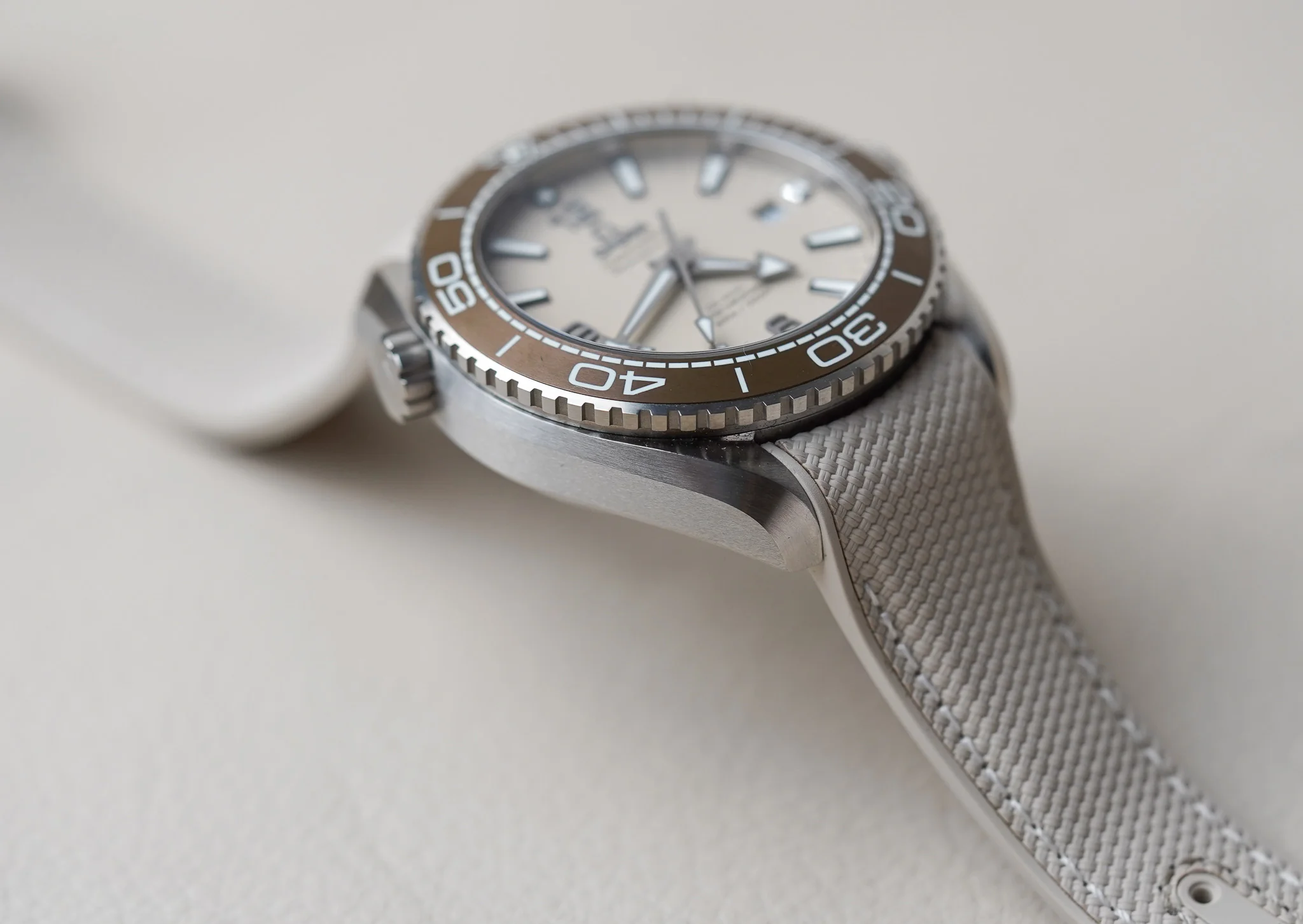 The dial is presented with a sand-blasted beige varnish and includes a date window at 3 o’clock, along with transferred words in brown and black. The OMEGA logo, Arabic numerals, hands, and hour markers are all in PVD grey with a brushed finish, while the white Super-LumiNova improves visibility in dark conditions.