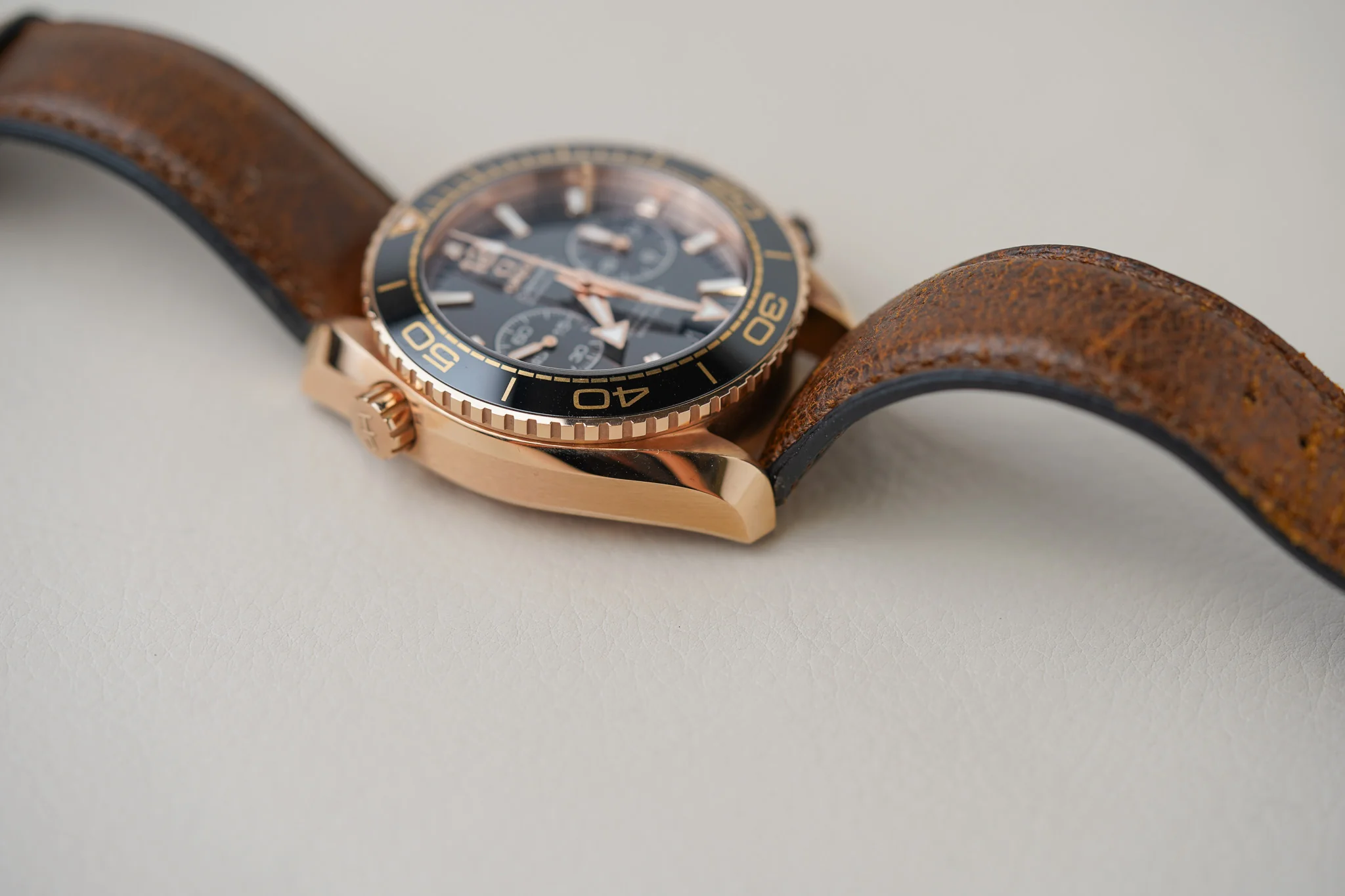 This model, with its scratch-resistant sapphire crystal, features a black ceramic dial with Arabic numerals and a date window at the 6 o’clock position. The dial presents a small seconds sub-dial, as well as 60-minute and 12-hour counters on one dial for intuitive reading of elapsed time. The black ceramic unidirectional rotating divers’ bezel, with its OMEGA Ceragold™ diving scale, is mounted on a 45.5 mm 18K Sedna™ gold case.