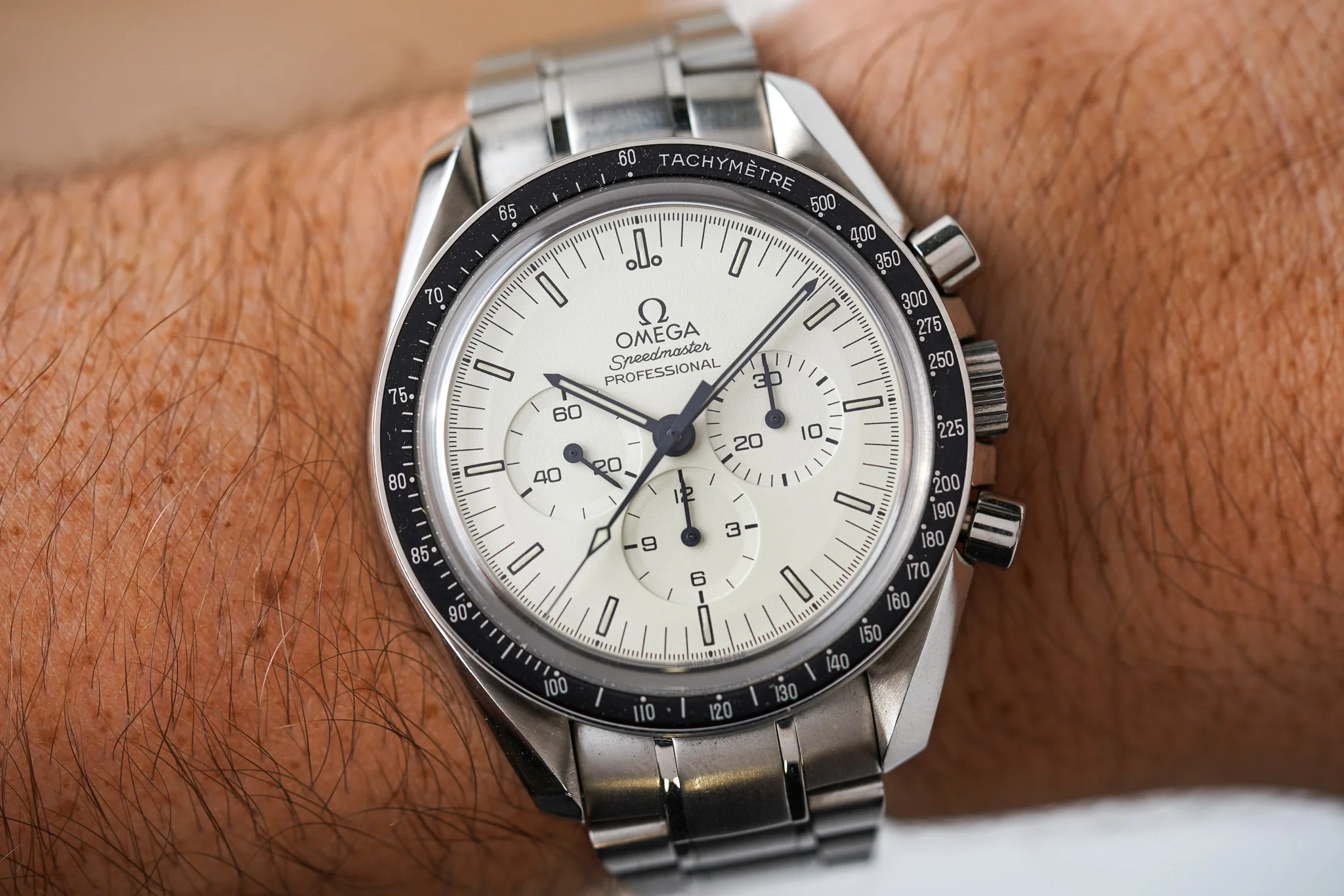 To celebrate the 40 years of the Speedmaster, OMEGA launched a limited series of 500 watches for the Italian market in 1997. This model featured a cream-colored dial, a caliber 1863 movement and a sapphire-crystal caseback. The front glass was also in sapphire crystal, which was unusual for the time because the normal luxury models were only fitted with such glasses in around 2002 on the PIC 3573.50 model.